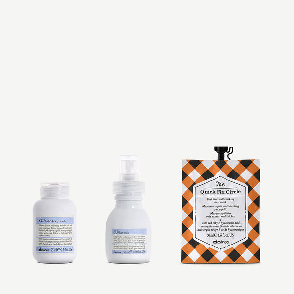 TCC THE QUICK FIX CIRCLE 50ML: AQUA / WATER / EAU, CETEARYL ALCOHOL, BEHENTRIMONIUM CHLORIDE, GLYCERIN, CETYL ALCOHOL, BEHENTRIMONIUM METHOSULFATE, CETRIMONIUM CHLORIDE, PARFUM / FRAGRANCE, POLYGLYCERYL-4 OLEATE, GLYCERYL STEARATE, QUATERNIUM-87, KAOLIN, SIMMONDSIA CHINENSIS SEED OIL / SIMMONDSIA CHINENSIS (JOJOBA) SEED OIL, BENZYL ALCOHOL, GLYCERYL OLIVATE, SCLEROTIUM GUM, SODIUM BENZOATE, HYDROGENATED RAPESEED ALCOHOL, TOCOPHEROL, CITRIC ACID, PROPYLENE GLYCOL, SODIUM HYALURONATE, GLYCINE SOJA OIL / GLYCINE SOJA (SOYBEAN) OIL, GUAR HYDROXYPROPYLTRIMONIUM CHLORIDE, ETHYLHEXYLGLYCERIN, PHENOXYETHANOL, TETRAMETHYL ACETYLOCTAHYDRONAPHTHALENES, HEXAMETHYLINDANOPYRAN, CITRUS AURANTIUM FLOWER OIL, LIMONENE, HYDROXYCITRONELLAL, LINALYL ACETATE, CITRONELLOL, HEXYL CINNAMAL. SU/ HAIR & BODY WASH 75ML: AQUA / WATER / EAU, SODIUM C14-16 OLEFIN SULFONATE, SODIUM LAUROYL METHYL ISETHIONATE, COCAMIDOPROPYL BETAINE, SODIUM PCA, SODIUM METHYL 2-SULFOLAURATE, DECYL GLUCOSIDE, POLYSORBATE 20, LAURAMIDOPROPYLAMINE OXIDE, PARFUM / FRAGRANCE, SODIUM COCOYL GLYCINATE, SODIUM CHLORIDE, BENZYL ALCOHOL, PANTHENOL, GLYCERYL OLEATE, COCO-GLUCOSIDE, SODIUM BENZOATE, DISODIUM 2-SULFOLAURATE, MYRISTAMIDOPROPYLAMINE OXIDE, GUAR HYDROXYPROPYLTRIMONIUM CHLORIDE, TETRASODIUM GLUTAMATE DIACETATE, POLYQUATERNIUM-7, PROPYLENE GLYCOL, PEG-120 METHYL GLUCOSE TRIOLEATE, CITRIC ACID, GLYCERIN, TRISODIUM ETHYLENEDIAMINE DISUCCINATE, CITRUS AURANTIUM AMARA FRUIT EXTRACT / CITRUS AURANTIUM AMARA (BITTER ORANGE) FRUIT EXTRACT, LINALOOL, ALPHA-ISOMETHYL IONONE, HYDROXYCITRONELLAL, CI 60730 / EXT. VIOLET 2.SU/ HAIR MILK 50ML: AQUA / WATER / EAU, CETEARYL ALCOHOL, PANTHENOL, ETHYLHEXYL METHOXYCINNAMATE, BEHENTRIMONIUM CHLORIDE, BENZYL ALCOHOL, CETYL ALCOHOL, TOCOPHEROL, AMODIMETHICONE, CETRIMONIUM CHLORIDE, PARFUM / FRAGRANCE, AMODIMETHICONE/SILSESQUIOXANE COPOLYMER, SODIUM BENZOATE, TRIDECETH-5, CITRIC ACID, GLYCERIN, CITRUS AURANTIUM AMARA FRUIT EXTRACT / CITRUS AURANTIUM AMARA (BITTER ORANGE) FRUIT EXTRACT, TRIDECETH-12, CYCLOPENTASILOXANE, LINALOOL, PHENOXYETHANOL, ALPHA-ISOMETHYL IONONE, HYDROXYCITRONELLAL.