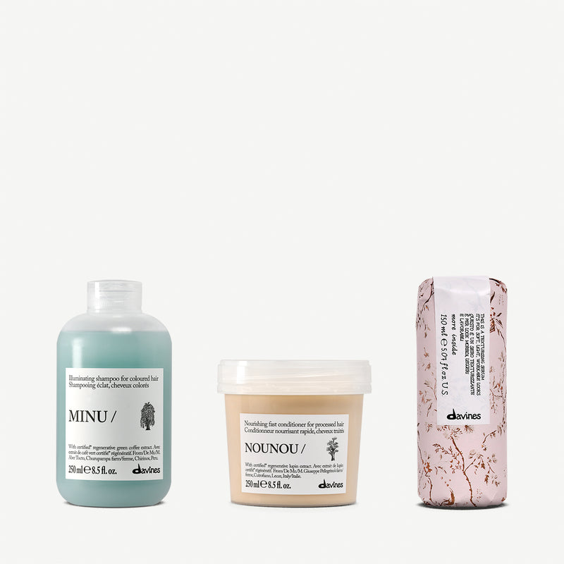 - Apply a small amount of NOUNOU/conditioner to clean, damp hair and massage through lengths and ends.
